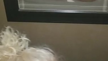 Titty brunette sucks cock on knees,